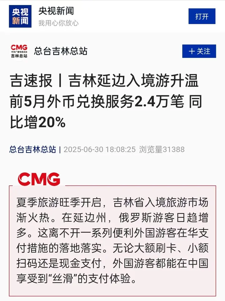 6月30日,延边广播电视台记者采写的《吉林延边入境游升温 前5月外币兑换服务2.4万笔 同比增20%》登上央视新闻客户端。亮眼数据展现延边文旅市场活力,也彰显其在对外开放中的国际影响力。