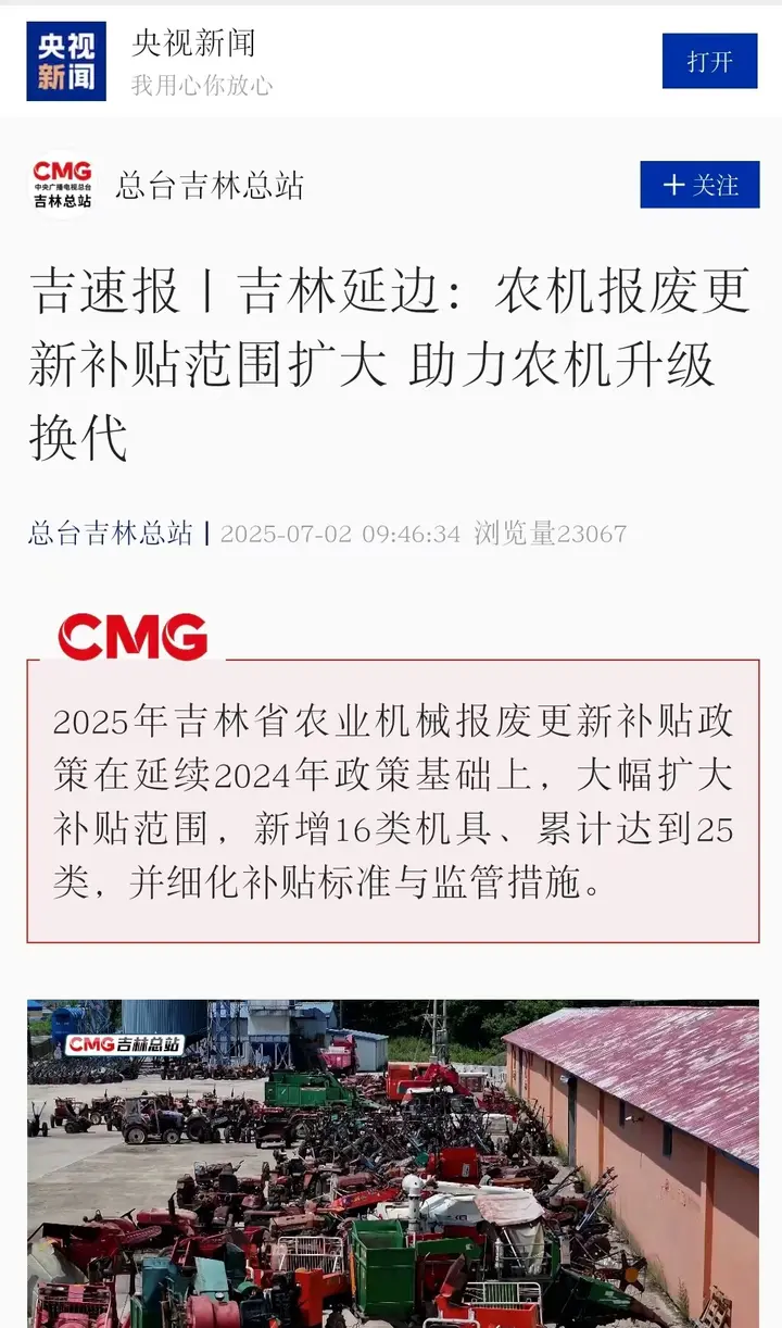 据了解,2025年延边农机报废更新工作已经开始,计划今年争取报废更新补贴700万以上,计划拆解老旧农机具1000台(套)以上,目前已争取到位首批农机报废更新资金384万元。