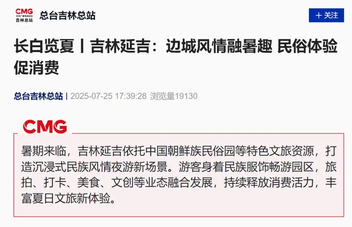近日,由延边广播电视台记者采写的新闻《吉林延吉:边城风情融暑趣 民俗体验促消费》7月25日被央视新闻客户端采用。延吉市通过打造中国朝鲜族民俗园旅拍与网红弹幕墙等文旅名片,不仅为游客带来了独特的旅游体验,也带动了夏日夜经济的发展。