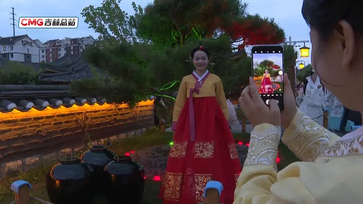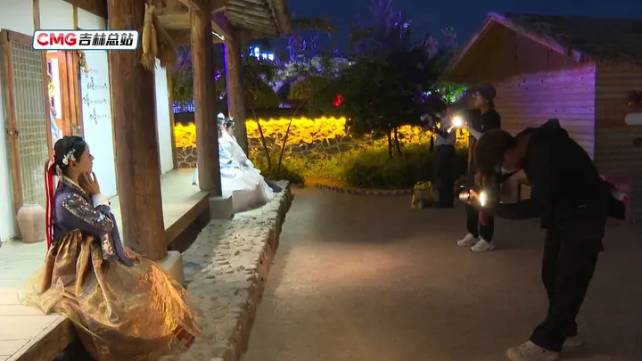 夜幕降临,走进中国朝鲜族民俗园,古色古香的朝鲜族传统建筑错落有致,飞檐斗拱、青瓦白墙,在灯光的映照下更显古朴典雅。游客们身着朝鲜族传统服饰,在其间穿梭,宛如时光的旅人。“我从事摄影快四年了,最近我们一个店夜间旅拍能出三四十单,晚上我们出来拍照都得排队。”张家豪是一名旅拍摄影师,近段时间,随着客流量的增加,他每天都要工作到深夜。