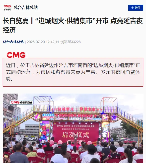 7月18日,由延边广播电视台记者采写的新闻《“边城烟火·供销集市”开市 点亮延吉夜经济》被央视新闻客户端采用。该集市由延边州供销集团主办,创新采用“国企主导+民企运营”模式,试营业20多天,接待游客18万人次,创造产值超900万元,成为延边州夜间经济的“流量担当”。