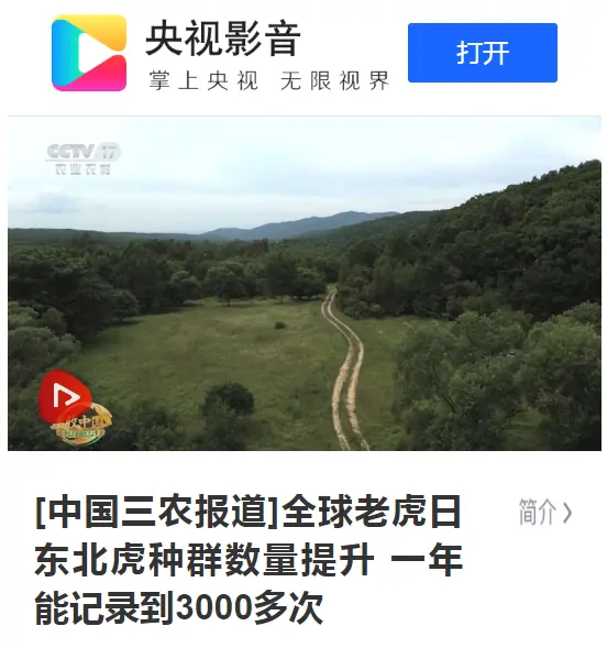 由央视记者与延边广播电视台、珲春市广播电视台共同采编的《[中国三农报道]全球老虎日 东北虎种群数量提升 一年能记录到3000多次》,7月29日在CCTV-17央视农业农村频道播出。