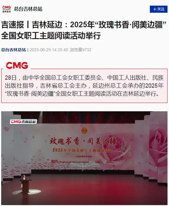 由延边广播电视台记者采写的新闻《吉林延边:2025年“玫瑰书香·阅美边疆”全国女职工主题阅读活动举行》8月29日被央视新闻客户端采用。