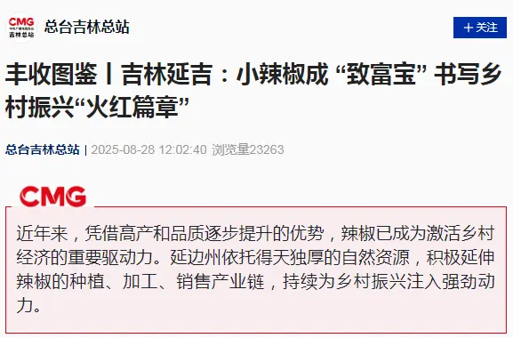 由延边广播电视台记者采写的新闻《吉林延吉:小辣椒成“致富宝”书写乡村振兴“火红篇章”》8月28日被央视新闻客户端采用。