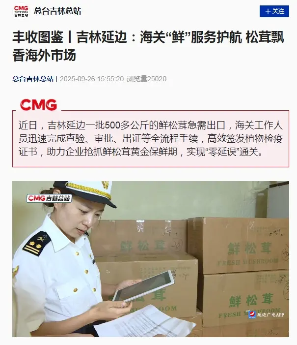 由延边广播电视台记者采写的新闻《吉林延边:海关“鲜”服务护航 松茸飘香海外市场》9月26日被央视新闻客户端采用。
